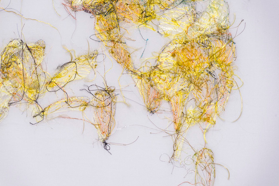 Hand embroidered with silk, viscose and recycled nylon threads on silk organza