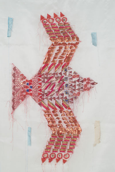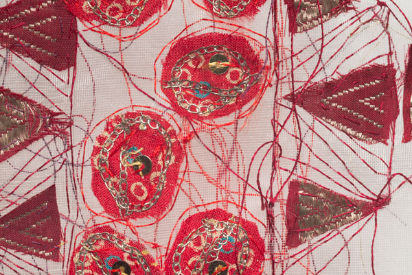 Hand embroidered with silk, viscose, metallic threads with vintage saris (with zari -silver) and sequins on silk organza