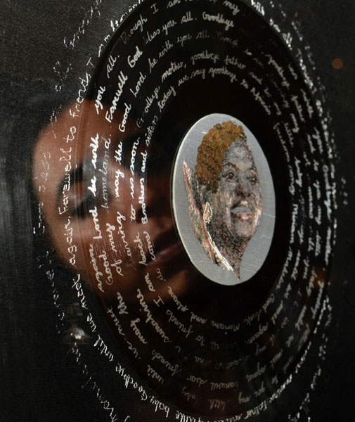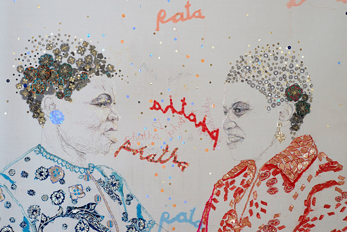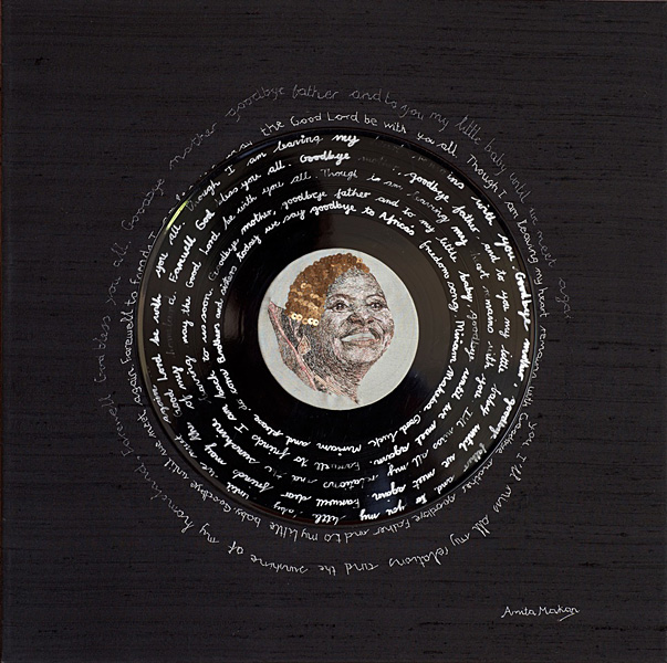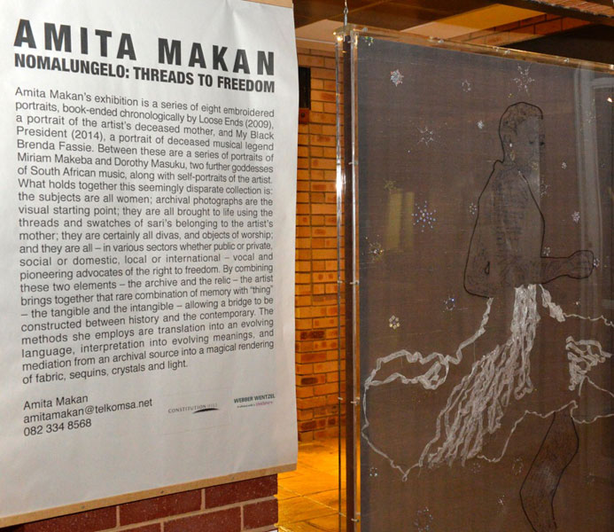 At its simplest level, Amita Makan's exhibition "Nomalungelo: Threads to Freedom" may be read as a series of eight embroidered portraits, book-ended chronologically by "Loose Ends" (2009), a portrait of the artist's deceased mother, and "My Black President" (2014), a portrait of deceased musical legend Brenda Fassie. Between these are a series of portraits of Miriam Makeba and Dorothy Masuku, two further goddesses of South African music, along with self-portraits of the artist. What holds together this seemingly disparate collection is: the subjects are all women; they are all brought to life using the threads and swatches of sari's belonging to the artist's mother; they are certainly all divas, and objects of worship; and they are all - in various sectors whether public or private, social or domestic, local or international - vocal and pioneering advocates of the right to freedom. View the full catalogue   ![]()