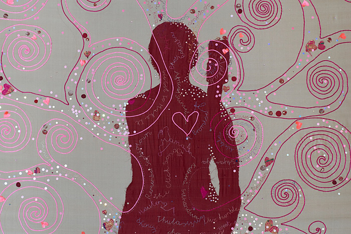 Embroidery wih silk and metallic thread on silk organza with Swarovski crystals, sequins and vintage saris
