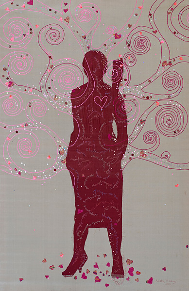 Embroidery wih silk thread on dupion silk and vintage sari, silk cord, sequins and Swarovski crystals (140.5 x 208.5 x 9.5cm)