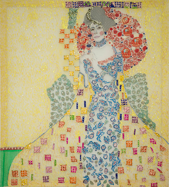 The second work, ‘Self Portrait: After Gustav Klimt’s Portrait of Adele Bauer Bloch I, 1907’ also explores the notion of ‘intersecting histories’. The Austrian born painter Gustav Klimt (1862-1918) himself was influenced by other cultures. I superimpose my portrait over Adele Bloch Bauer using embroidery. Fragments of vintage saris, integral to my ancestral identity, now inspired by Klimt, are re-patterned.