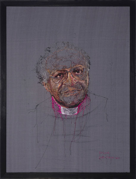The hand-embroidered portrait is inspired by a photograph of Archbishop Emeritus Desmond Tutu taken at his residence in Bishopscourt, Cape Town in 1988 by Rashid Lombard.