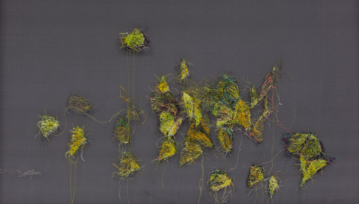 Hand embroidered with silk, viscose, metallic and recycled nylon thread on silk organza