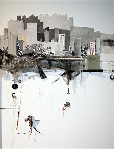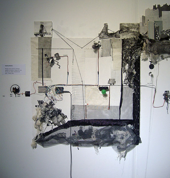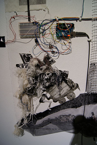Medium: Wall Installation, mixed media: prints: drypoints and monotypes, cotton waste, physical computing components: arduino uno board, servo motors, DC motors, potentiometer, LED lights, stopframe animation, found objects, thread, gauze and shade cloth.