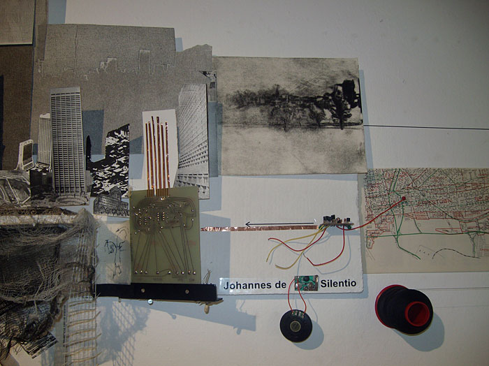 Johannes de Silentio is a work in progress that explores the atmosphere of the absurd that one may feel when living in Johannesburg. This work sketches an imaginary world of city living and underground chaos. It maps strangers paths through this world, recording the figures' movements forward, upwards and sometimes falling down. The installation maps the earthly tremors that may cause a stranger to be knocked off balance, and charting the attempts of these strangers to regain their stability after vacillating from side to side. The images included in this presentation are of the alpha prototype for the Johannes de Silentio installation.