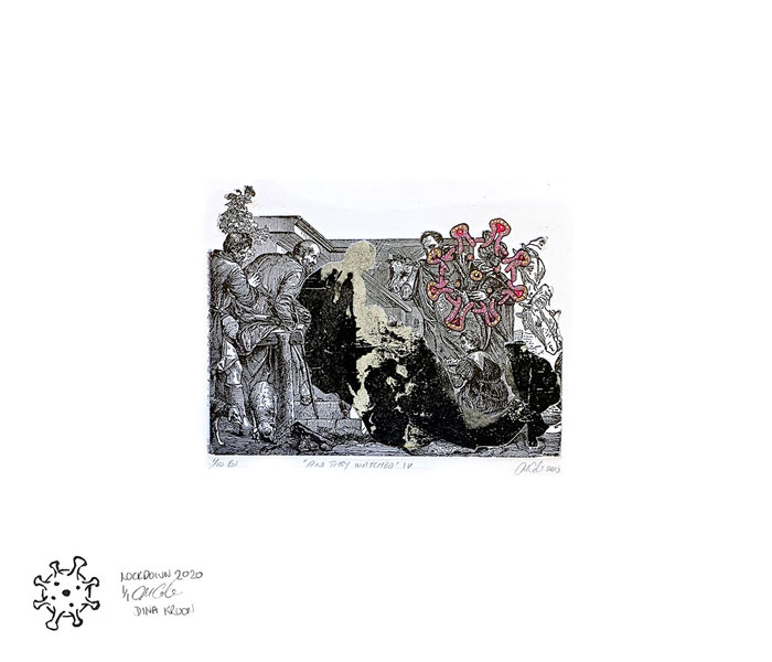 Artist:  Collin Cole and Dina Kroon (collaboration) Title:  And they Watched IV Medium: Etching, Chine Colle and hand colour Size:  42 x 36cm Framed Price on Request