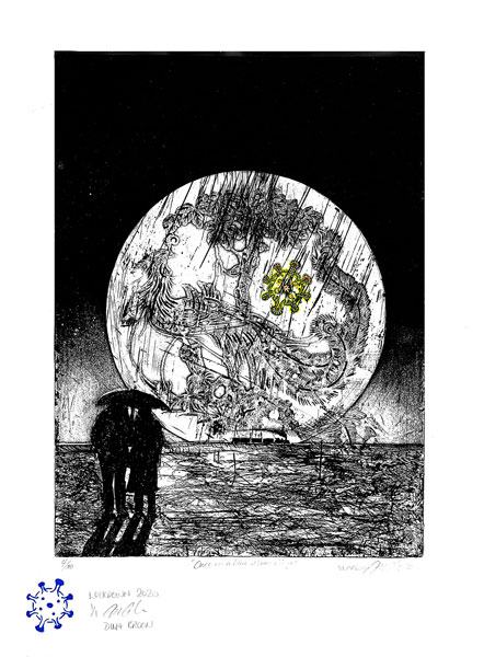 Artist:  Collin Cole and Dina Kroon (collaboration) Title:  Once in a Blue Moon Rising Medium: Etching with hand colour Size:  43,5 x 32,5cm Unframed Price on Request