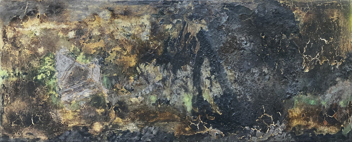 Artist:  Elfriede Dreyer Title:  Saving grace of sound Medium: Encaustic, ink and oil on wood Size:  900 x 350mm, framed in Kiaat Price on Request