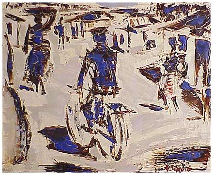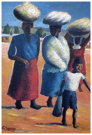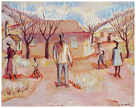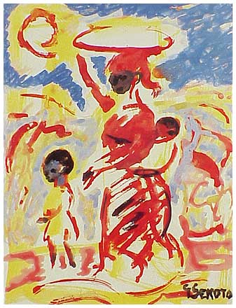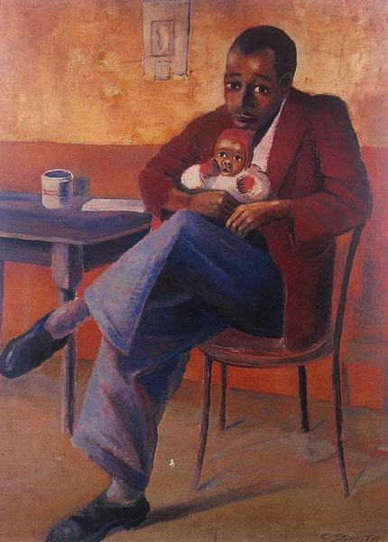 In 1938-9, he left teaching and moved to Sophiatown, Johannesburg to pursue career as full-time artist. He stayed with his cousin and painted on brown wrapping paper with poster colours. He was then introduced to Joan Ginsberg of the Gainsborough Gallery as well as Judith Gluckman who taught Sekoto to use oil paints in her studio (illegal under the apartheid regime) and Alexis Preller who gave him his first tubes of oil paint.