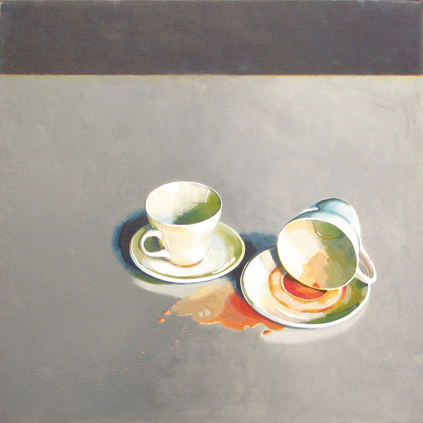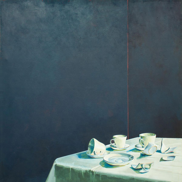 While Nel's earlier work frequently features the tea cup as a recurring device symbolising the domestic sphere, in these later renditions, completed in the mid-2000s, they are fractured, fragmented and overturned - suggestive of some earlier physical or psychological violence. The spillage and subsequent staining that results from this disturbance seem to imply a loss of control or, perhaps, blood. This inference is especially relevant in light of the national increase in, and normalisation of violent crime, especially that of sexual assault, since South Africa's political transition in 1994.