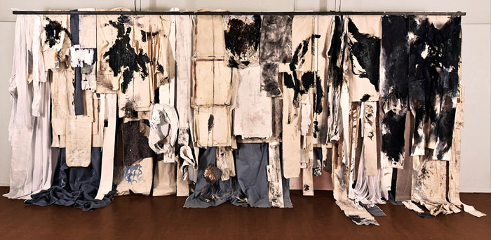 Melancholia, Oil, acrylic, wood ash, industrial enamel, found muck, wood glue, resin, bedding, felt, canvas (front view), 250 x 600 x 36 cm, 2017