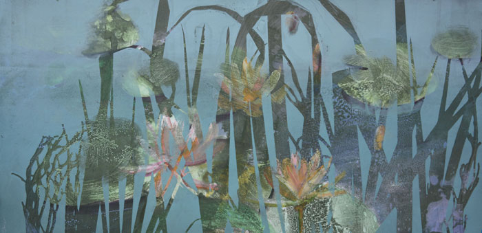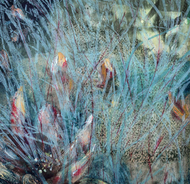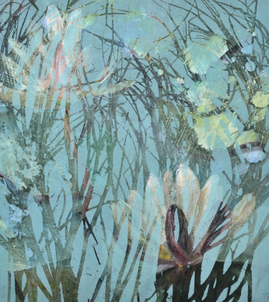 The technique I have used is monotype – the painterly print. I have tried to create layers of light and colour, movement and texture through the process of wiping and layering of ink, often using up to three plates to create one print.