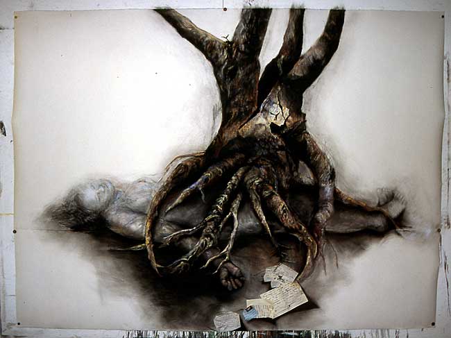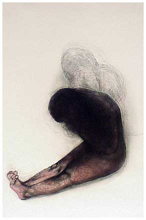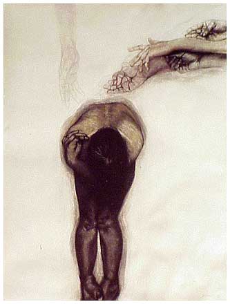 The drawings on this exhibition are drawn in charcoal and pastel on large sheets of 400gram Arches paper. They speak about a deep sadness, an anxiety, and a fear of life, these feelings stem from an emotionally deprived childhood, creating feelings of never being good enough which have stayed with me well into adulthood.