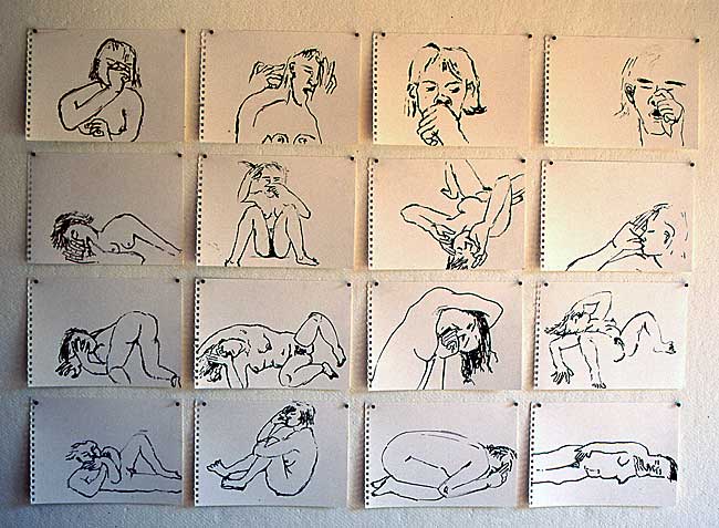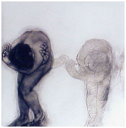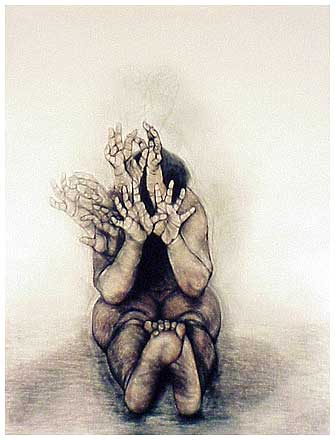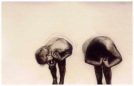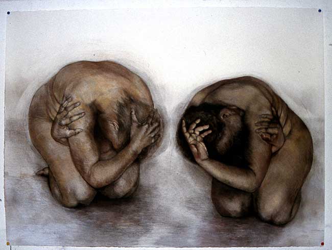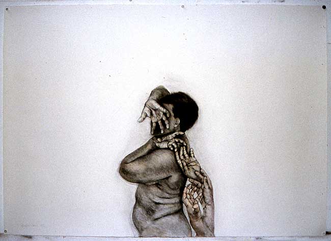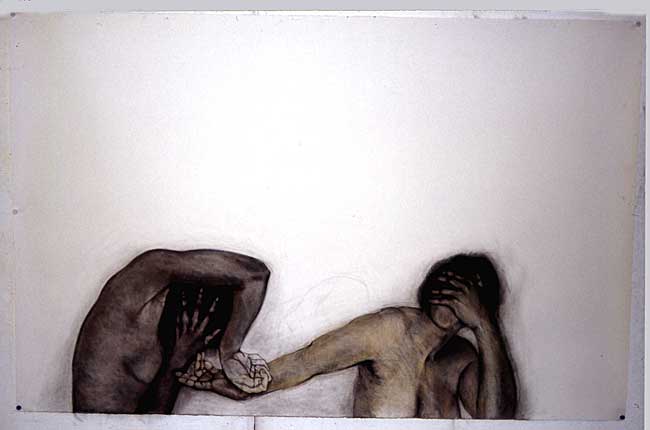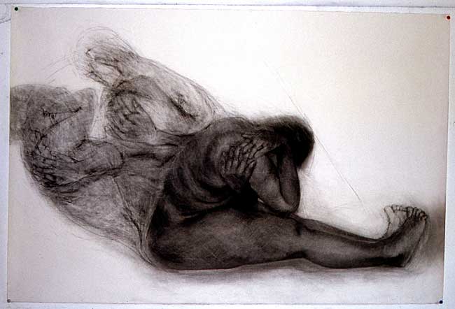 The method that I used when drawing these images, was to first roughly draw the figure in the position that I wanted, then to photograph my model in this position, always using someone who was close to me. I would then work from the photographs, which were often cut up, and re-assembled to create the awkward compositions that I needed to convey the angst.