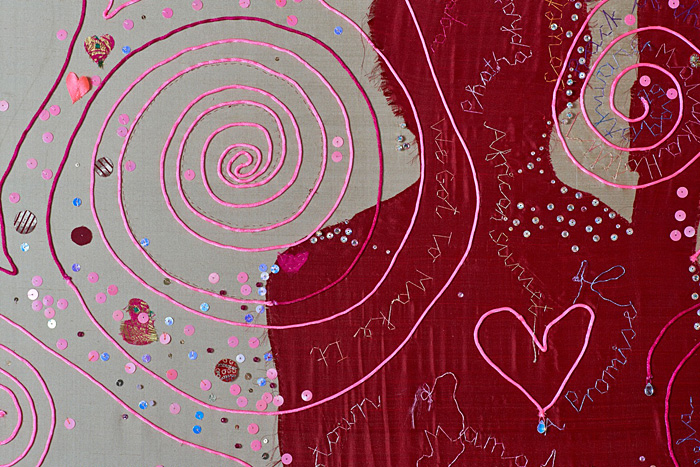 Embroidery wih silk thread on dupion silk and vintage sari, silk cord, sequins and Swarovski crystals (140.5 x 208.5 x 9.5cm)