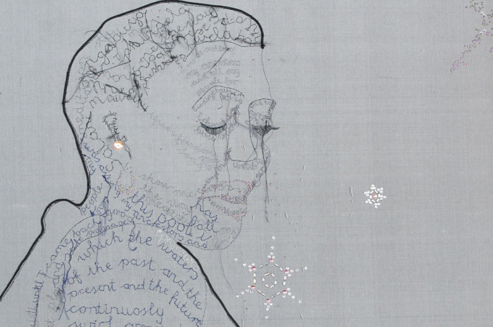 Embroidery wih silk and viscose thread, silk cord, organza ribbons and Swarovski crystals on dupion silk (134 x 194.3 x 9.5cm)