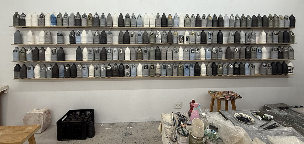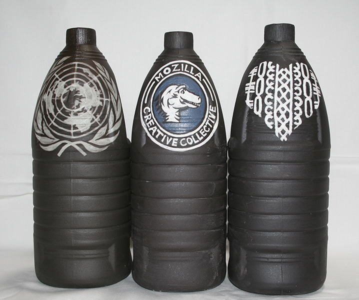 This wide range of mediums and processes allows her to experience and question expressions and boundaries of traditional art forms. The themes revolve around consumerism, using found objects like the plastic Jik bottle; and this coupled with references to brands. The viewer is told the Jik bottle is slip cast porcelain but this simulation enhances a cognitive dissonance, of the true nature of the Jik bottle.The artworks become containers or vessels for re-vised meaning, thereby becoming transformative and ‘unfixed’ in any one linear meaning or interpretation.