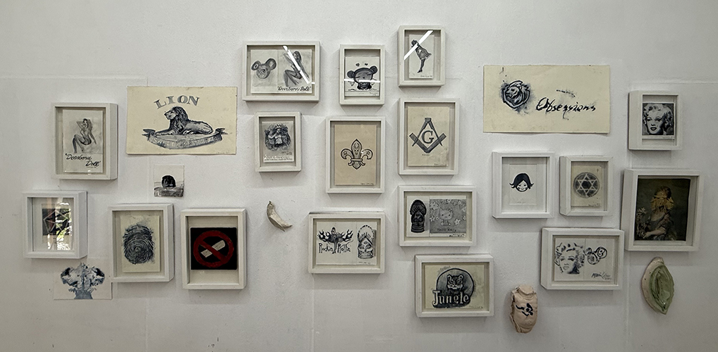 In this assemblage of works, the artist works across various mediums: drawing, watercolour, ceramics and installation.
