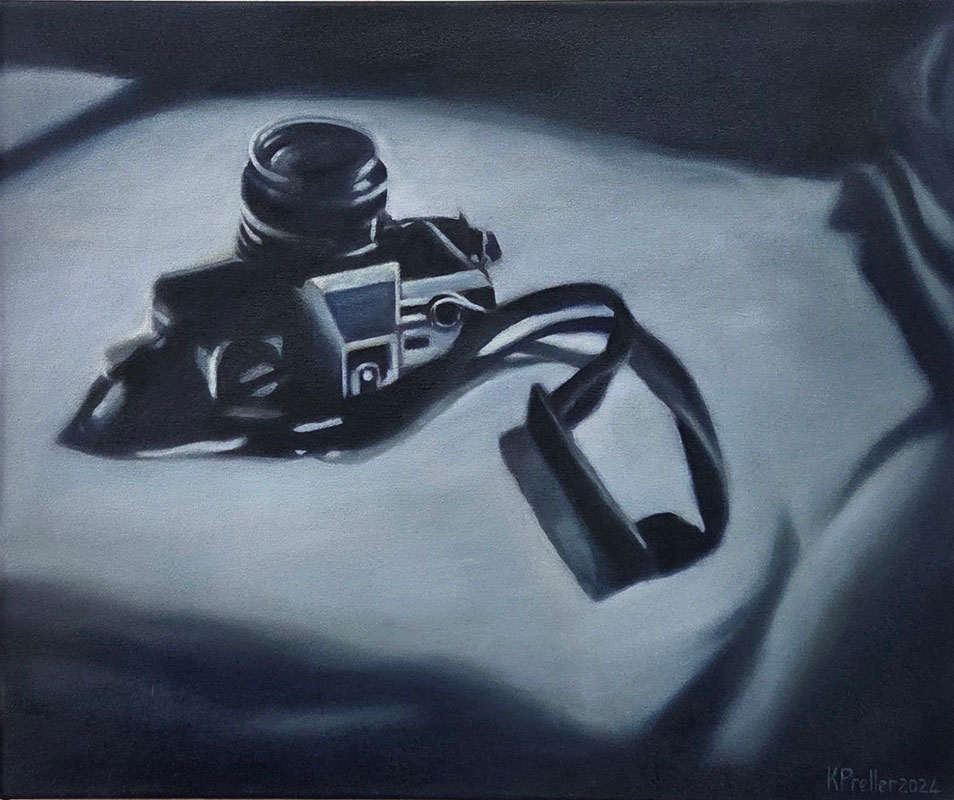 The paintings make visible the central role that the camera’s mediation plays in my process. They are emphatically photographic in the way in which they have been painted: in the flattening of shadows and light; depth and shallowness of field; the blur effected by the camera; and the contrast between vibrant colour and monochrome grey, the latter a reference to my work based on old black and white photographs and film stills. Photography sets the subject matter at a double remove, adding to the haunting and melancholy stillness that underlies the apparent chaotic compositions. In a sense every still life is a memento mori – a reminder of the fragility and transience of existence, of the immutable and silent presence of objects.