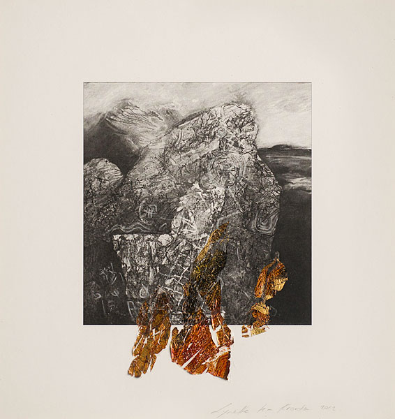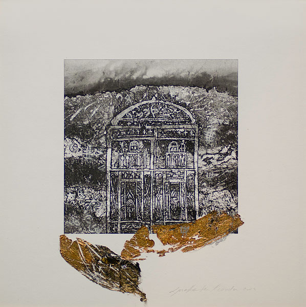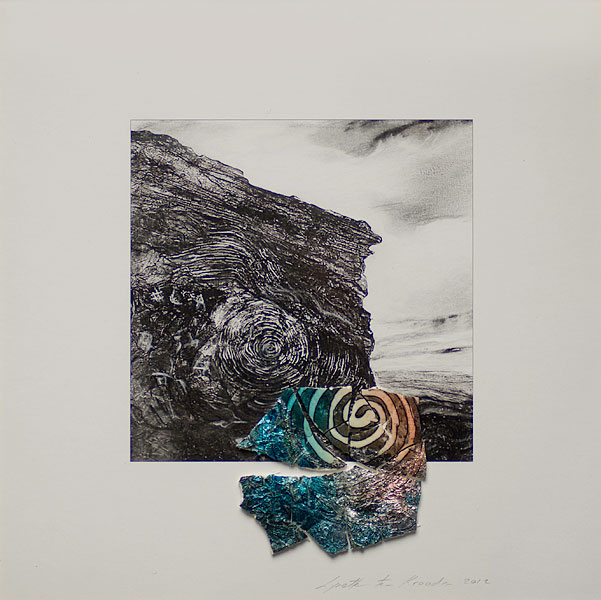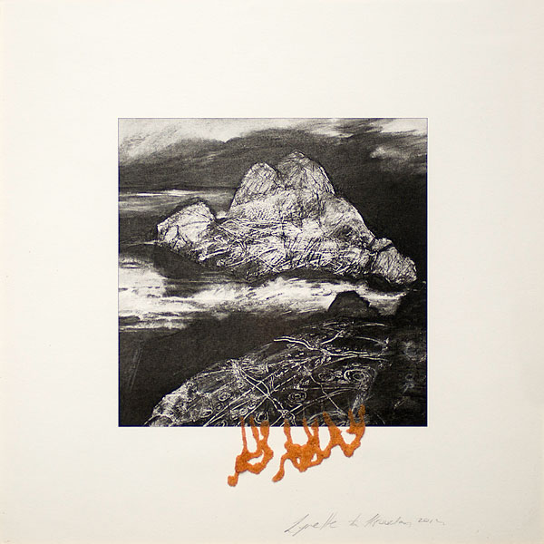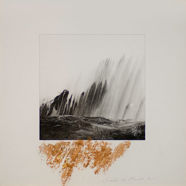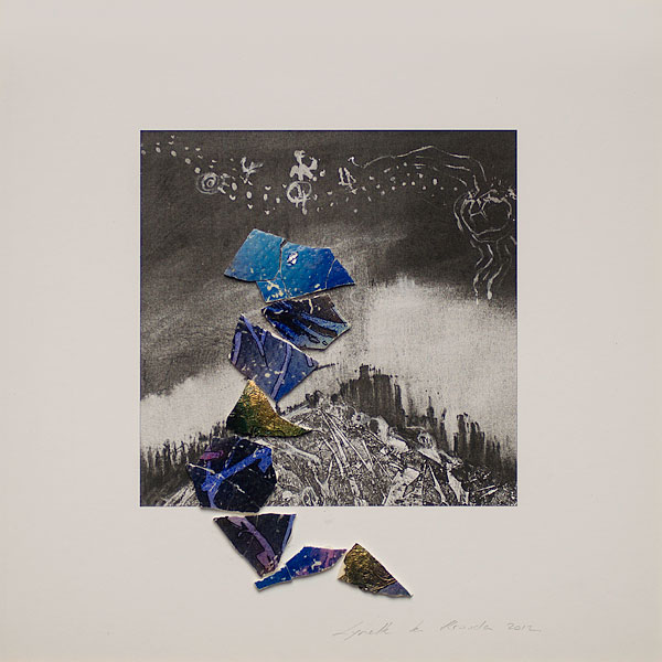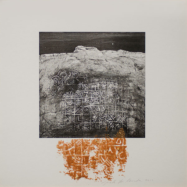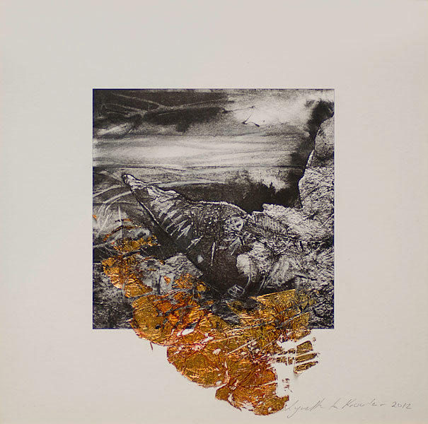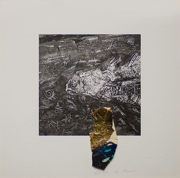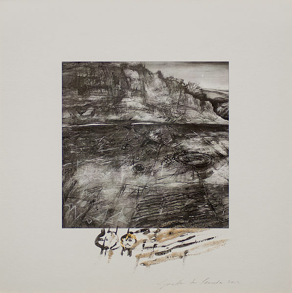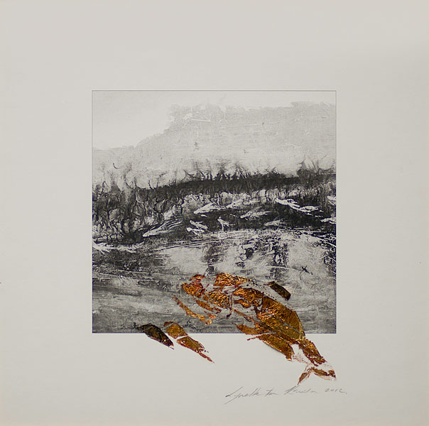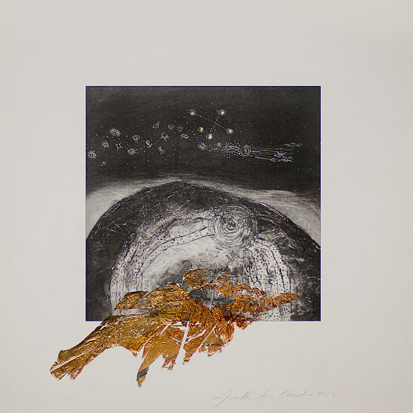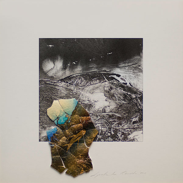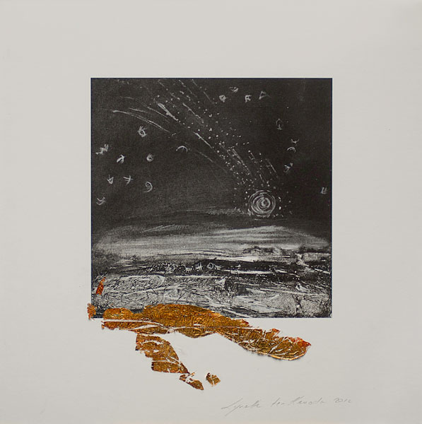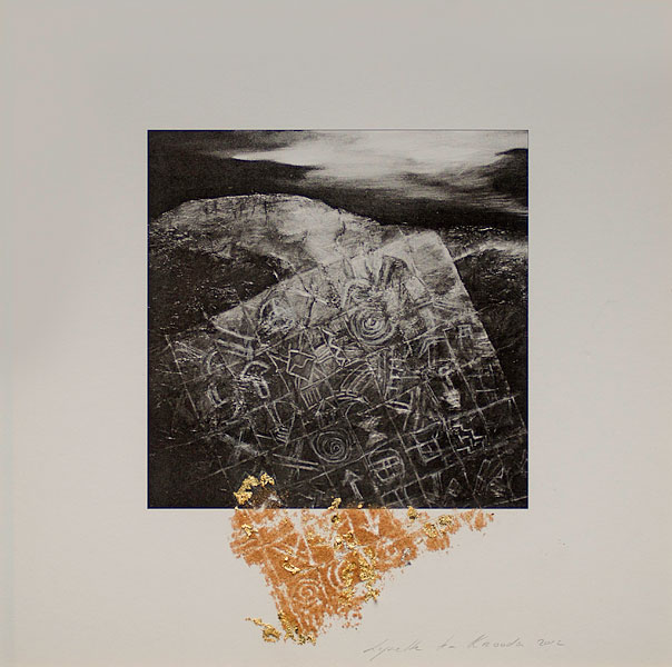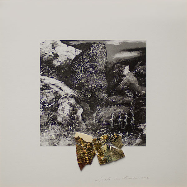 In her works she pursues those themes she explored for the past 30 years. Wide spaces, rock formations and vistas, deserts and night skies sprinkled with millions of stars, the markings left by old civilizations of their rituals and also fossils captured in layers of sediment - all witnesses of by-gone times. She combines her small monotone works with sand from the Kalahari, the Limpopo valley and beaches along our sea coasts, as well as bits of painted ostrich shells, pieces of lost vases and flasks and gold leave fragments.