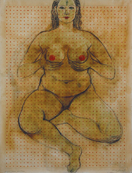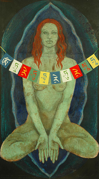 Gesso, graphite, oil, and prayer flags on Stonehenge paper (77cm x 140cm)