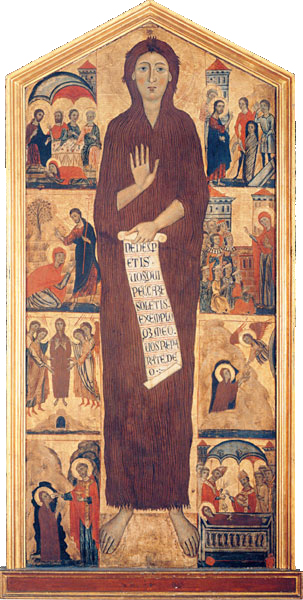 In the 13th century painting by the Master of the Magdalene, the hairy hermit is depicted holding a scroll that reads: "Do not despair those of you who are accustomed to sin, and in keeping with my example, return yourselves to God."