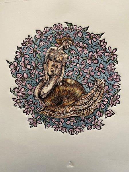 Medium: Hand coloured linocut