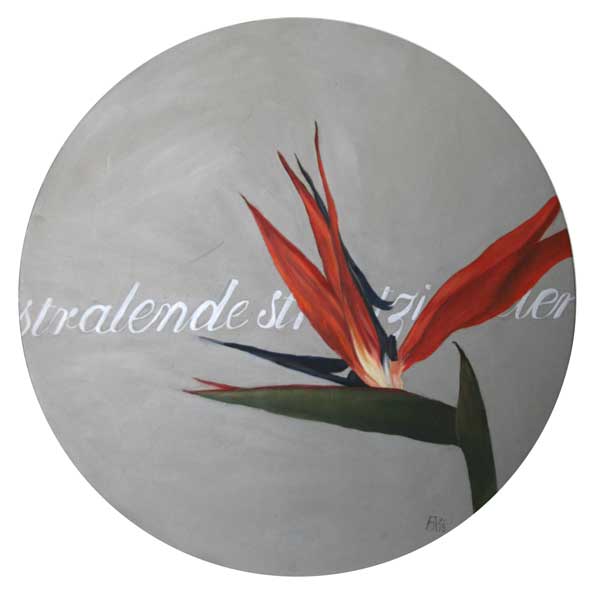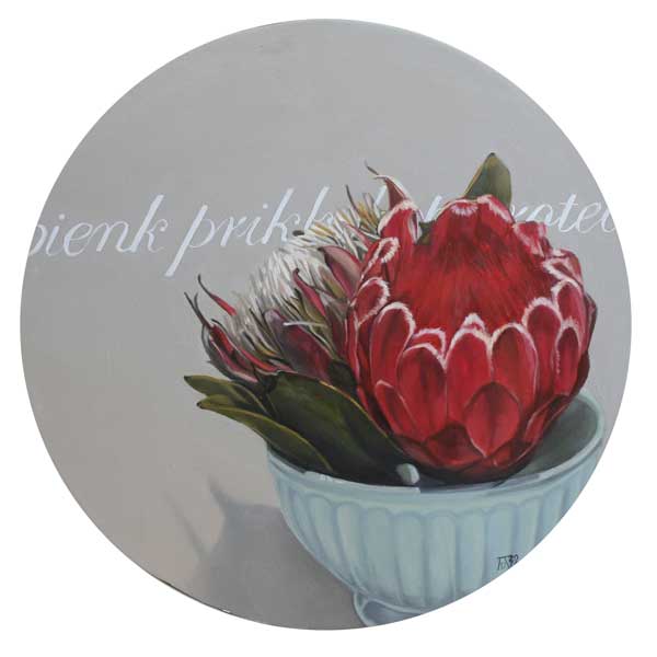 The works will comprise indigenous flowers such as proteas, red hot pokers and pincushions, entwined with Afrikaans words (in reference to various feminine natures) in the background. Whilst drawing meaning from the associations of flowers with the feminine, the artist also comments on female Afrikaans identity which is slightly different from the gentle and weak role generally assigned to women.