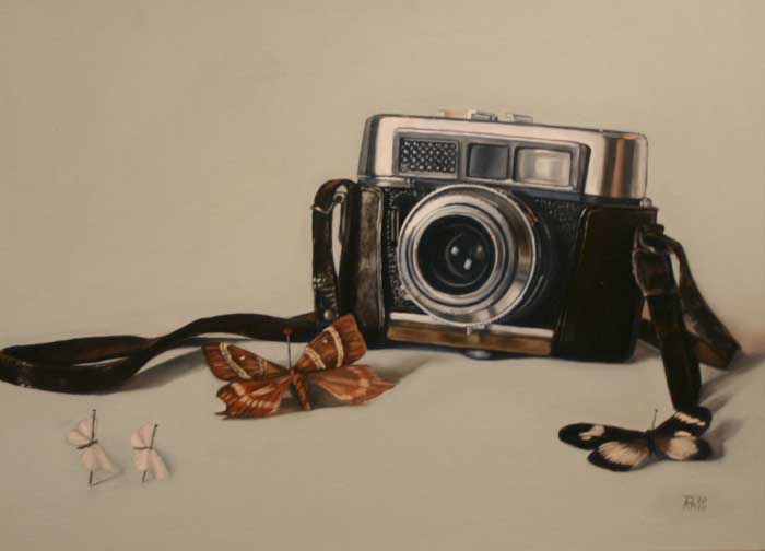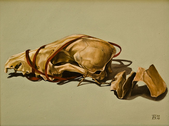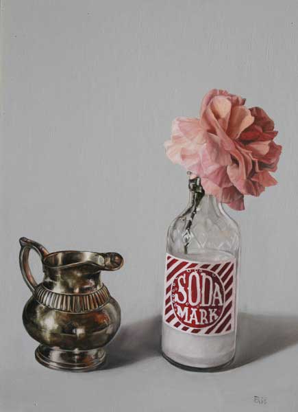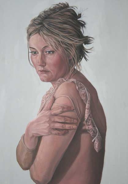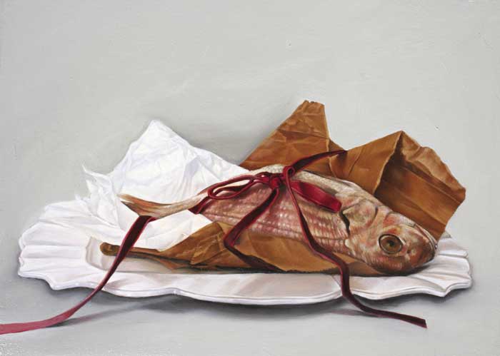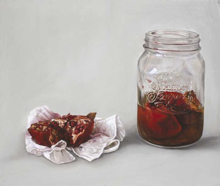 Works are installed in a manner akin to a wall of family portraits and indicates that these dreams and desires that fade away should be treasured and seen as that which, in facts, keeps us (or our bodies at least) alive. Central to the exhibition is a self-portrait (completed in desaturated flesh tones) which is flanked by a number of smaller works referencing various still life objects (as found in typical Vanitas paintings of the 16th and 17th centuries in Flanders and the Netherlands). The objects illustrated in the smaller paintings make reference to a particular desire or hope and, in each case, contain the colour red, thereby signalling life. The objects are imbued with symbolic and personal meaning and are chosen for the references made to both the tradition of art and conceptual considerations. The Vanitas tradition renders the exhibition another layer of meaning: The word, Vanitas, is of Latin origin and literally means “emptiness”. The genre traditionally deals with the concept of momento mori (a Latin word literally meaning “remember you must die”) and usually includes objects referencing death, ageing and the brevity of life (skulls, butterflies and moths, overripe fruit, crystal and silverware). These works are known for their technical proficiency as it is executed in a photorealist manner which, once again, relates to the artist’s method of working.