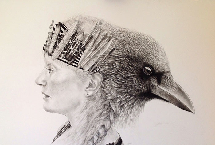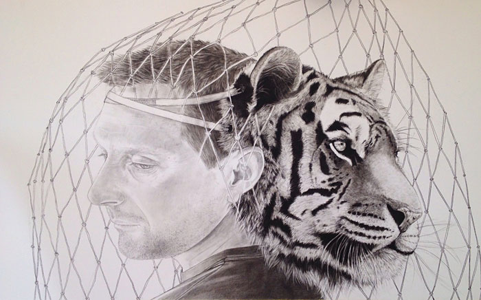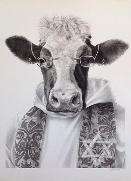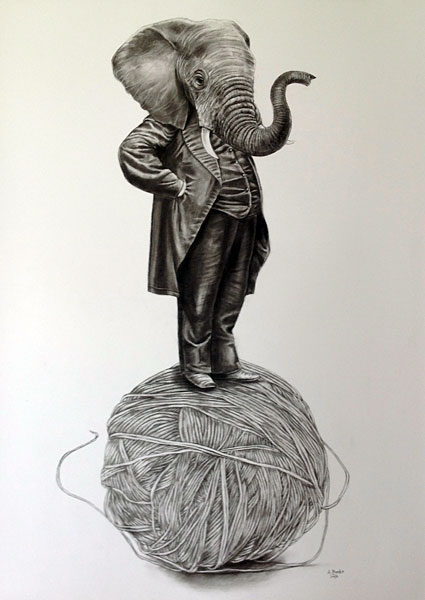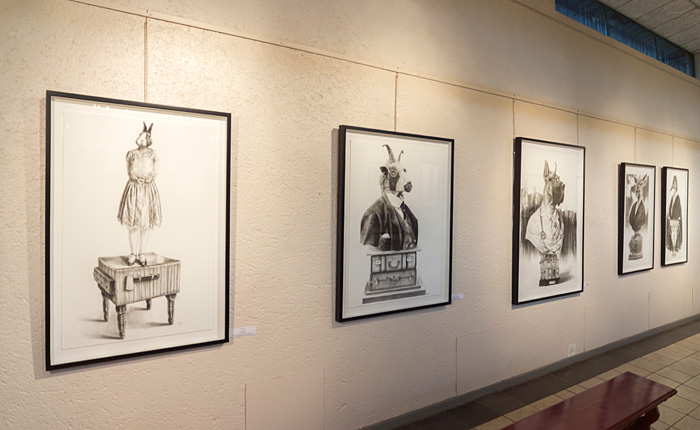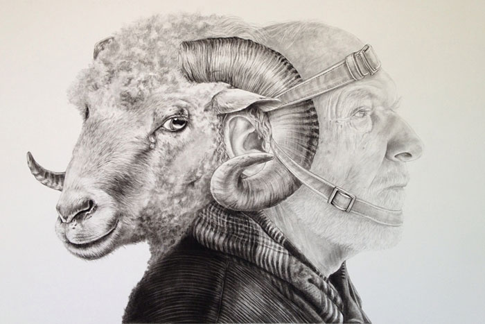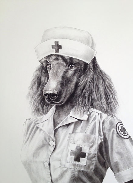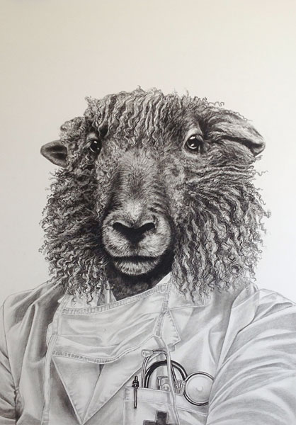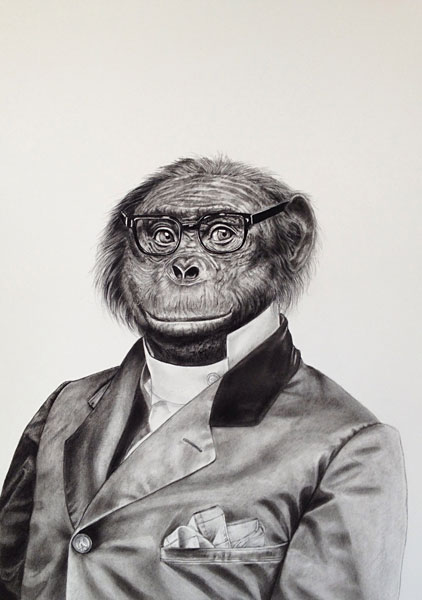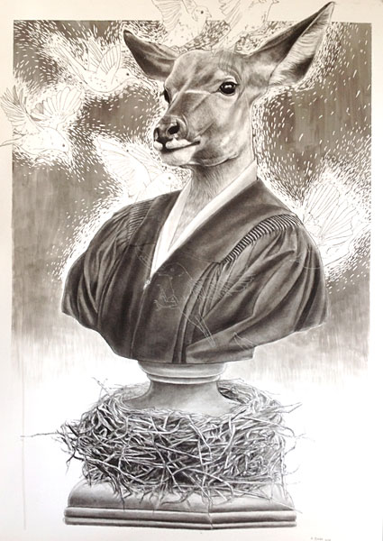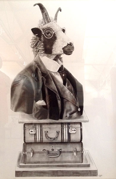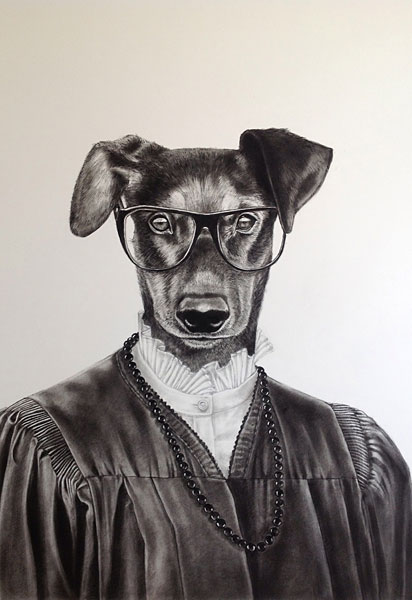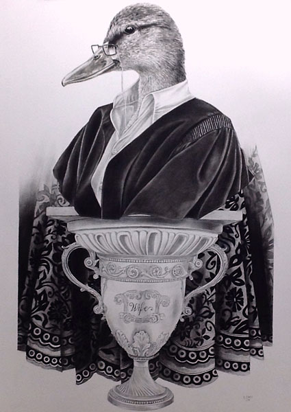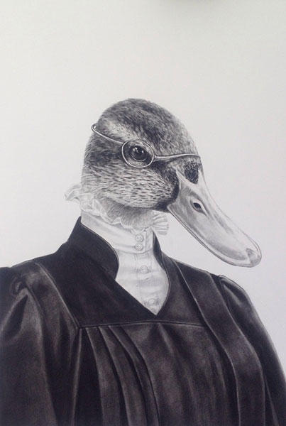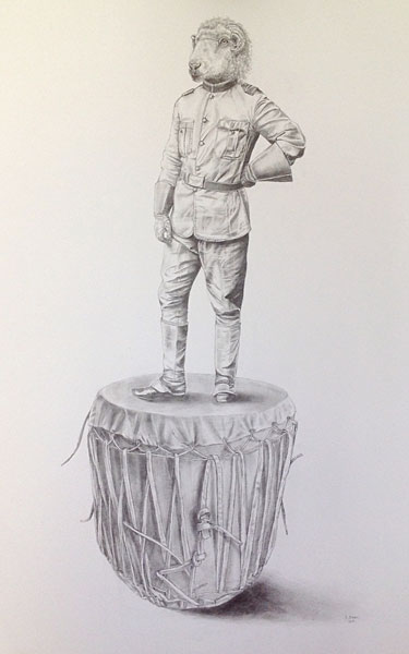 The animal head or portrait is used within the works as a representative mask which deliberately alters the identity of the subject, most of the time in jest. The hybrid figure in my work lends towards creating a new identity while covering up the old, undesired or true self. I like to poke fun as those who hide or masquerade behind their job titles, social or political profiles, and like to humorously reveal and conceal elements about the individual. My amalgamation of the human and animal illustrate an adaptation one has made either by desire or necessity in order to cope with their own personal situation, to fit in and be accepted within society or to elevate and promote themselves as valuable and important.