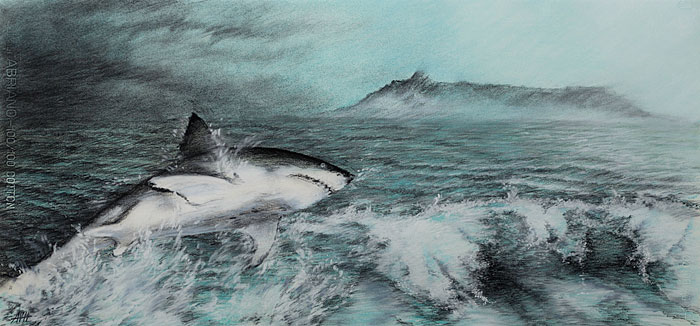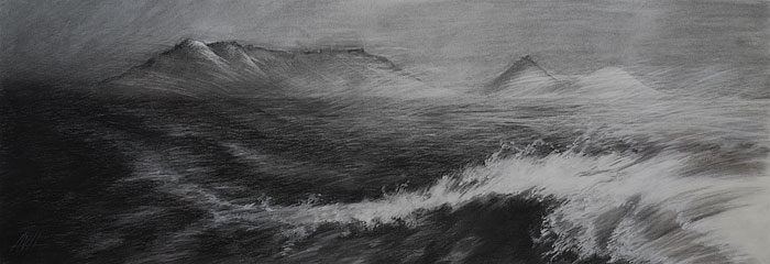 In this series of chalk pastels on paper, my first shifty impressions of the Cape when arriving by ship from Angola as a young child, are my shifting horizon. In a gloomy apocalyptic world menacing ‘things’ such as Great White sharks (themselves facing extinction), tsunamis or gliding stealth bombers become ironic threats to the fuzzy yet timeless tabular mountain in the distance. I have playfully entitled this small series “Rounding an imaginary cape”, aware that explorers of yore, as well as survivors of the future could never quite experience the Cape that I’ve created…