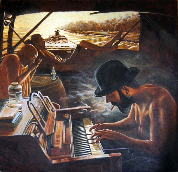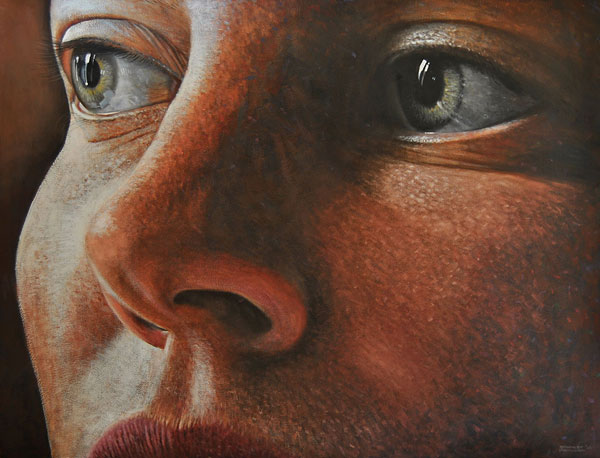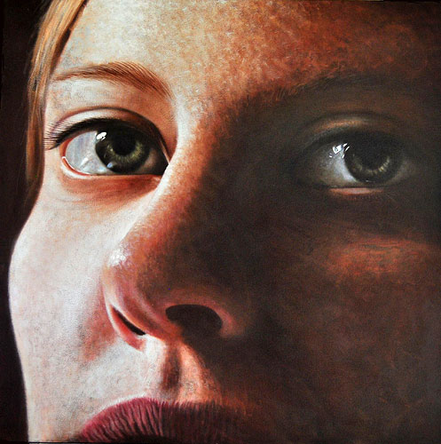 The faces is used in a particular way as it reflects the aspect of communicative eyes. Its visual dazzling effect and its presence on a grand scale. The large scale also forced me to work and solve large spaces on the canvas. Working these spaces with interesting paint effects and developments of brushwork that carries an expressive and thus more abstract quality into my paintings, that has not been present there before. The growth of this interesting but bravely unknown area that I wonder into in my work I find very stimulating in its excecution. The other fun aspect of these large faces is the fact that they change in mood and feel as the daylight fades into twilight,even just moonlight in a room unravels a strange beauty from them. This is caused by the bold big simplistic features.