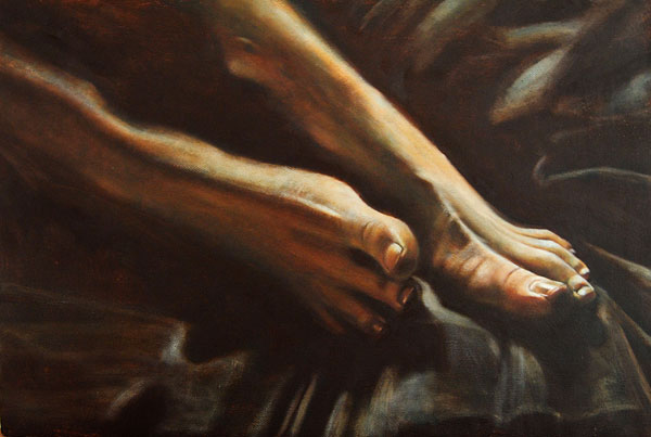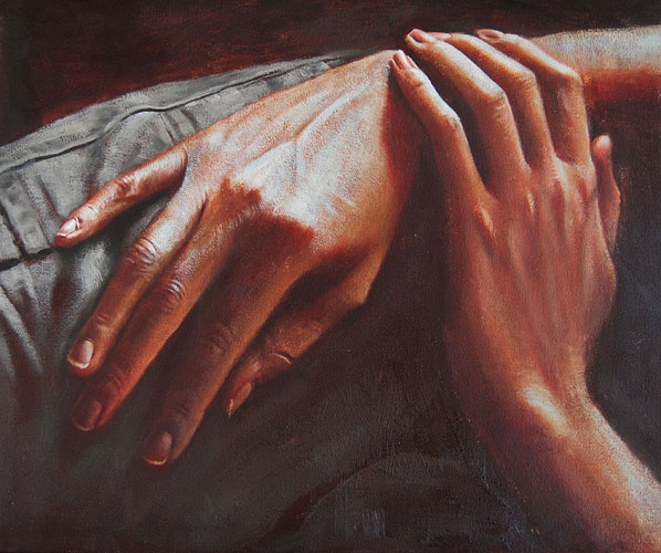 The works that is coming out of my studio lately is all an interesting experience of delving into details of my usual work,which normally involves full scale female figures mostly. Going into this view of detailing opens up a whole new concept of looking at my painting world. It brings new elements and feels all realistic and abstract,modern and old. This is hands, feet and faces that each carry with them a hefty amount of individuality and with interesting light it makes all the food one needs to make a strong painting. They are bold, fun, light and strong in simplicity.