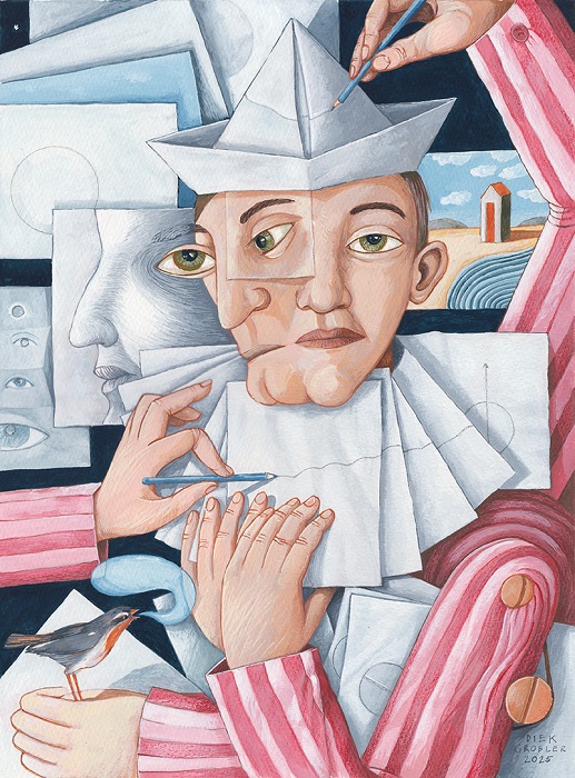Artist:  Diek Grobler Title:  The Animator (Living in the invisible interstices between frames) Medium: Gouache on Paper Size:  384 x 284 mm
