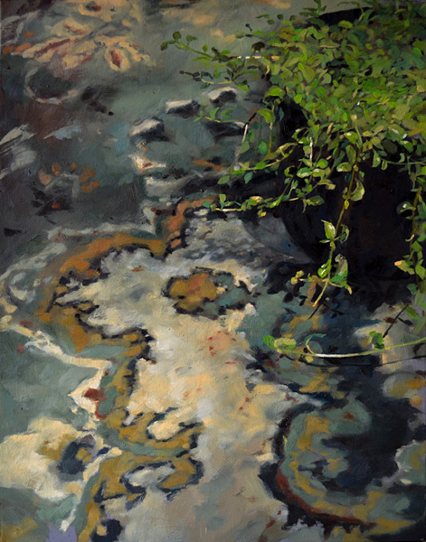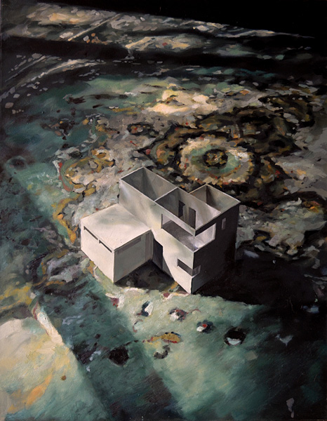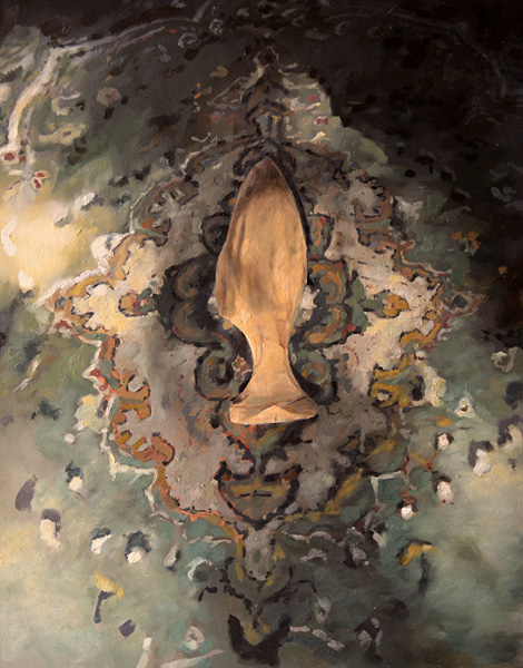 These still life paintings are faithful renderings of the constantly fluctuating observed world, which are reworked in the language of paint, inevitably changing its meaning. These surreal domestic landscapes capture fleeting moments where constantly moving cast shadows of leaves, cast an abstract pattern over the decorative abstract pattern of the carpet. The still life objects are representative models for real world counterparts. It is not a fish, nor the representation of a fish, but a representation of a carved fishlike object. The “house” is only the representation of a model of an imagined house. The plant is a sample of nature taken into the domestic realm and potted for containment.
