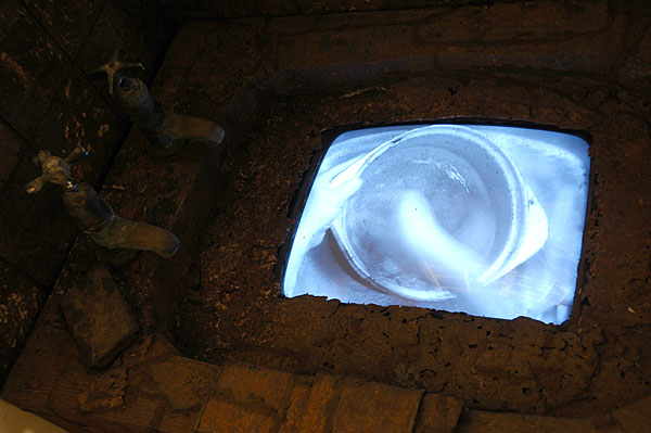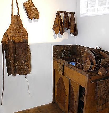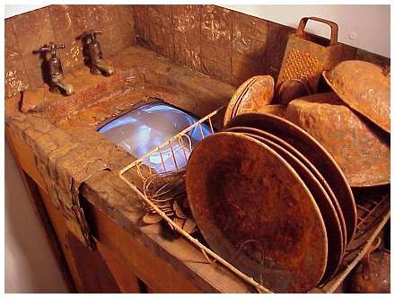 The installation comprises of a kitchen sink with dishes, dish cloths, oven gloves and an apron, all made from found and rusted objects. Built into the basin is a TV Monitor with the image of hands continuously cleaning a pot and above the sink is the projected image of a window through which rain on a courtyard is visible. The basin is installed in the corner of the exhibition space and "walled" and "curtained" off so that the viewer has to enter a small room.