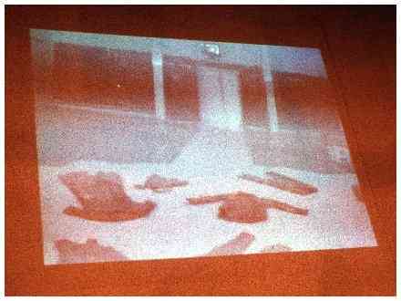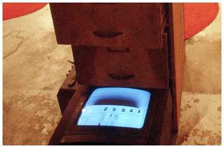 The "real" objects in the installation are echoed on screen; the video monitors and technology that are visible as part of the work "mediate" and "present" the real events. Our reality is shaped as much by them as by those with political power.