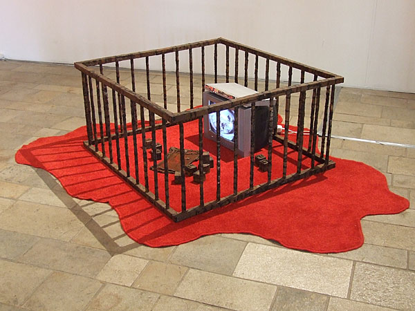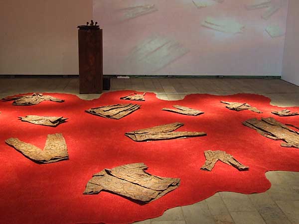 The installation The Red Carpet places focus on the vulnerability of ordinary people and children who become victims of political events and social realities. The red carpet is a metaphor for power and also for the frailty of human beings, as it suggests the flowing of blood. The remnants of people, the rusted clothes and other objects, are presented within the context of the structures that impact their lives.