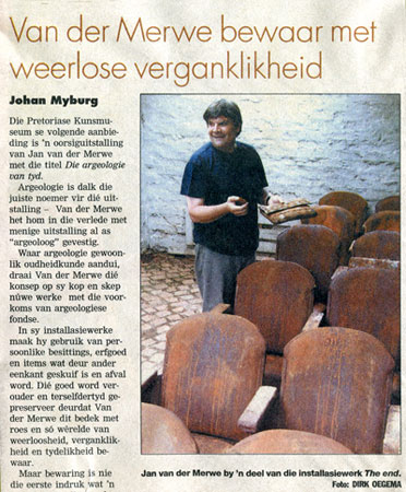 Die Pretoriase Kunsmuseum se volgende aanbieding is oorsiguitstalling van Jan van der Merwe met die titel ‘Die argeologie van tyd’. Argeologie is dalk die juiste noemer vir dié uitstalling – Van der Merwe het hom in die verlede met menige uitstalling al as “argeoloog” gevestig. Waar argeologie gewoonlik oudheidkunde aandui, draai Van der merwe dié konsep op sy kop en skep nuwe werke met die voorkoms van argeologiese fondse. In sy installasiewerke maak hy gebruik van persoonlike besittings,erfoged en items wat deur ander eenkant geskuif is en afval word. Dié goed word verouder en terselfdertyd gepreserveer deurdat Van der merwe dit bedek met roes en só werelde van weerloosheid,verganklikheid en tydelikheid bewaar. Maar bewaring is nie die eerste indruk wat ‘n mens kry by die aanskoue van dié werke nie – eerder weerloosheid. En dan selfs meer as net weens die tande van die tyd. Die afwesige mense wat in en om die werke onsigbaar bly talm, gee daaraan ‘ngevoel van broosheid anderkan nostalgie. The End, die instalasiewerk wat Van der Merwe vir hierdie uitstalling geskep het, bestaan uit 108 fliekstoele in rye gerangskik, met ‘n gevoel van grafstene waarna die kyker afkyk. Soos in ‘n begaafplaas. En die kyker word met dié afkyk tegelykertyd genoop tot nederigheid. Die kreatiewe spanning in Van der Merwe se werk kom derhalwe na vore deur meer as net materiaaalgebruik. Van der Merwe se Die argeologie van tyd is van vnadag tot 29 Oktober in die Albert Werth-saal, Oos-galery en de foyer van die Pretoriase Kunsmuseum te sien.