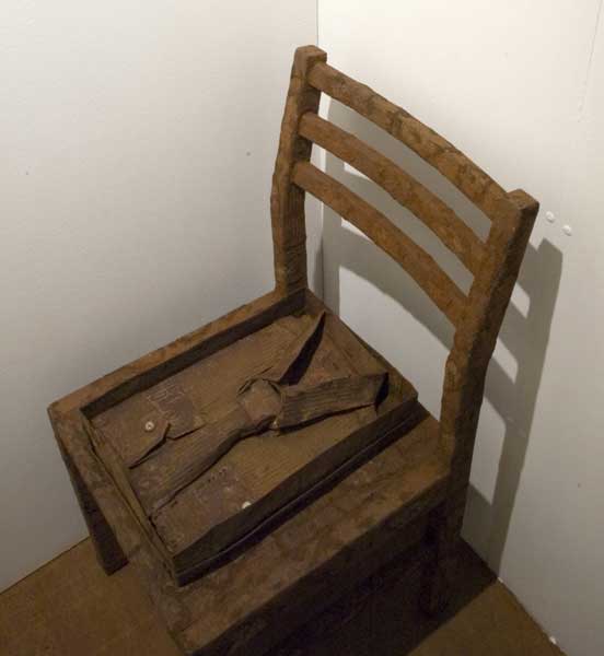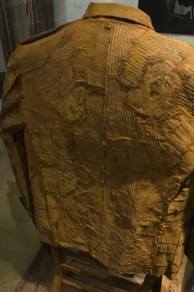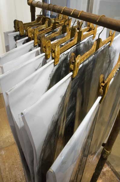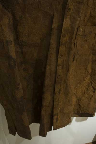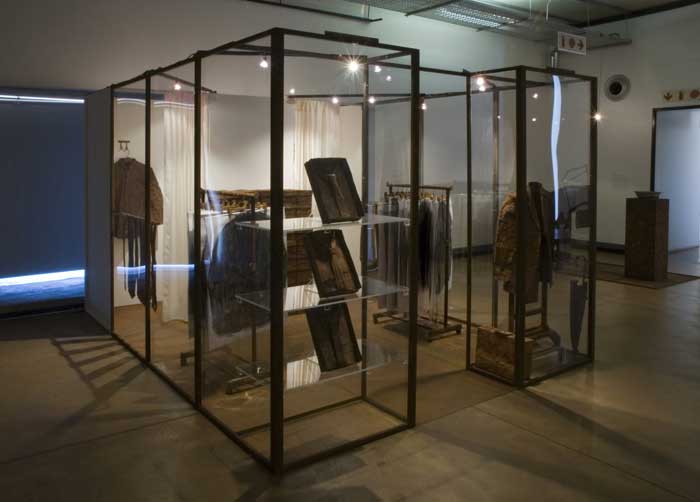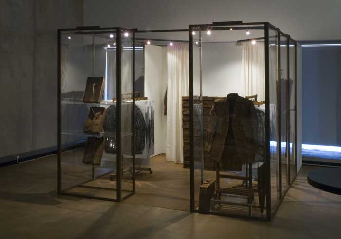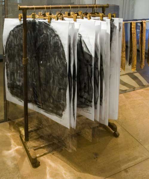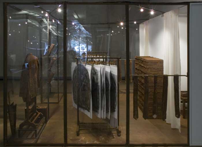 The "shop" with clothes become a monument. The stack of shoe boxes reminds of a memorial wall and the charcoal drawings in plastic sleeves of body bags. The "fitting