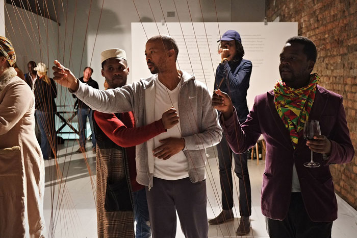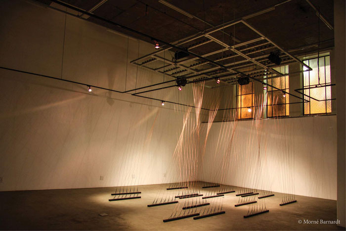"Burchell's technological aptitude and craft as a sculptor are a give; what is most striking is her use of sound to create an impressionistic record of place and memory." - Artsy, 2015. "The wires are purely a technological bridge to an aural end, linked to speakers which deliver a unique sound loop that suddenly elevates the entire setting into a compulsive pilgrimage into an audio-driven world of memory and of delight. Each strand speaks with its own special voice.” - Jaroslav Kalac, SA Arts Diary, 2014 “This evolutive “memory harp” plays sounds taken from our everyday environments, allowing the visitors to create their own tune. And, as the artist regularly adds new strings and sounds from the cities where the piece is shown, Homing also appears as a living organism, a universal creature, building delicates links between people and cultures from various countries.” - Valerie Douniaux, Be Art Magazine, 2015 "Visitors can "play" or "conduct" the dissonant notes of an urban orchestra. Burchell invites us to reflect on how these sounds evoke notions of home, but they also allow aural exploration of places unknown" - Chris Thurman, Business Day Live, 2015. "The Room becomes a musical playroom, in which an audience reduced to childlike wonder can strum, pluck and arrange the multitude of nostalgic voices to create tiny sonic symphonies. It is in the seemingly endless permutations of sound that each lucky participant can find their own resonance" - Jaroslav Kalac, SA Arts Diary.