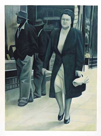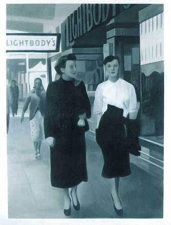 The painting uses as inspiration an old photo taken by a street photographer. He might possibly have been a rare downtown dark businessman. The two women shopped in a “protected” space in which other races were not absent, but largely invisible. Stuttafords, Ansteys, and John Orrs were exclusive, where haughty, formally costumed shop assistants looked down their narrow white noses. Black people heaved the goods behind the scenes. The picture exudes white nostalgia: