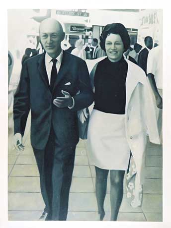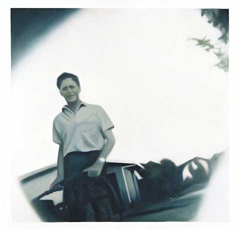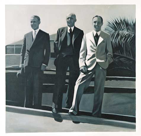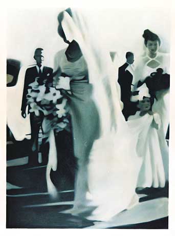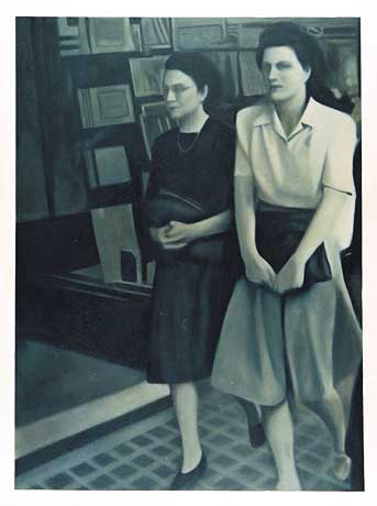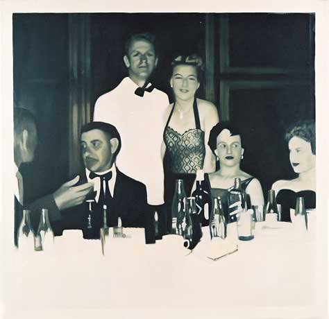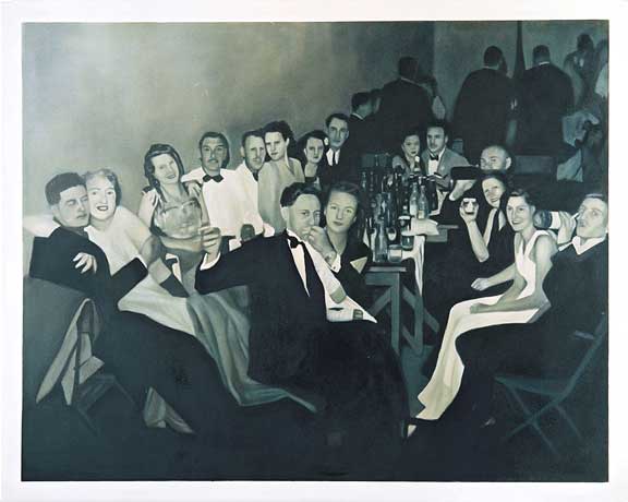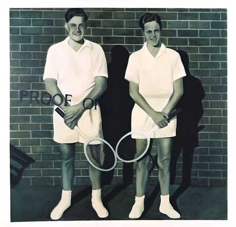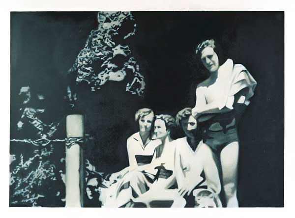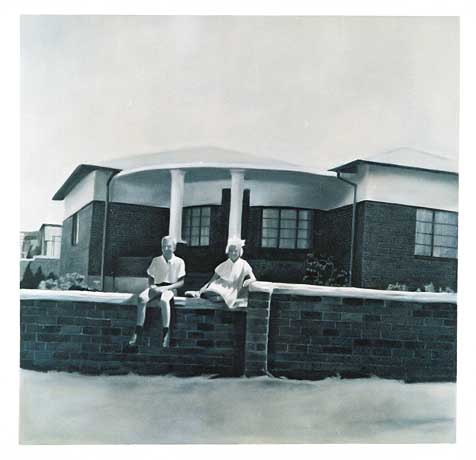 Preller reproduces on large scale old black and white family album photos, dating from the forties to sixties, of Chris and Rienie Venter and their family. But the more you study this microcosm of white middle-class suburbia, of low brick walls, red polished stoeps, holidays at ‘Toti and men who wouldn’t be seen dead in public without a trilby hat, the more enigmatic it becomes. Who are the unidentified bit-players who flit in and out? Who is Chris’ tennis partner, so like him they could be brothers? Above all, why is Doris, who married John van Zyl, ten years later walking arm in arm with Willie Overbeek, looking very much part of a couple?