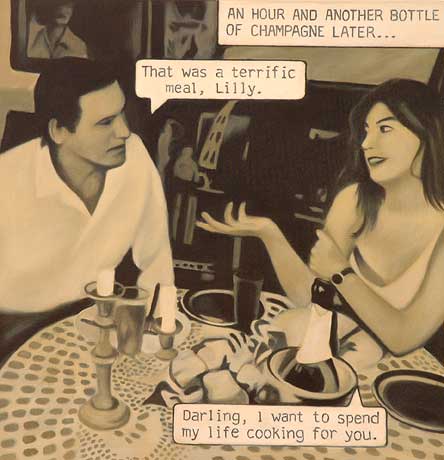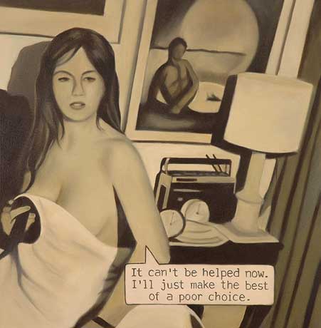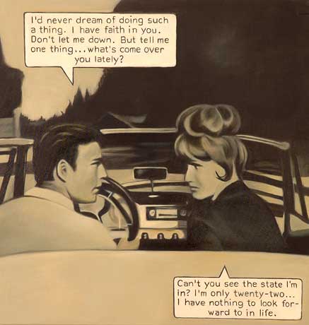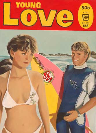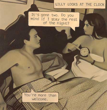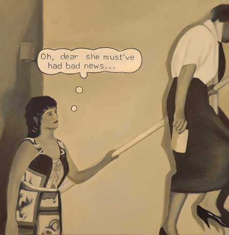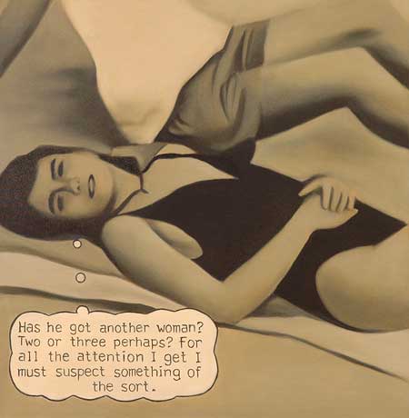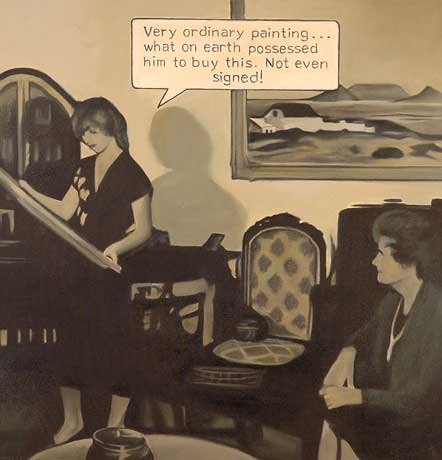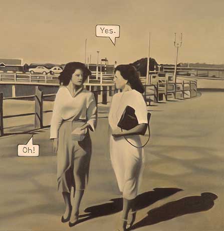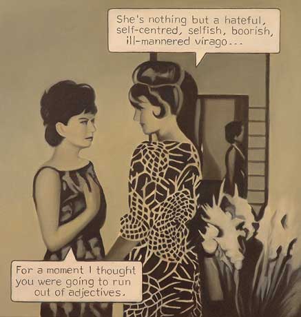 Although speech bubbles are included no particular narrative is intended and construction of any narrative is left to the viewer. What is highlighted is certain aspects of popular culture, its audience, and (white) society at the time (for example the role and treatment of women) – something which is not effected by the magazines themselves. Humour, through the speech bubbles and exaggerated gestures, is an important part of the work.