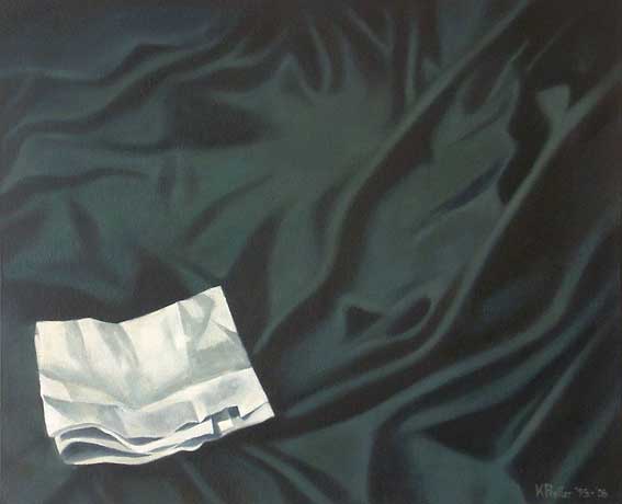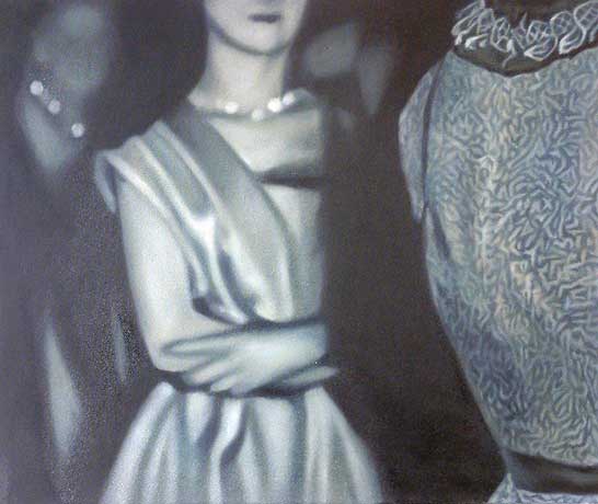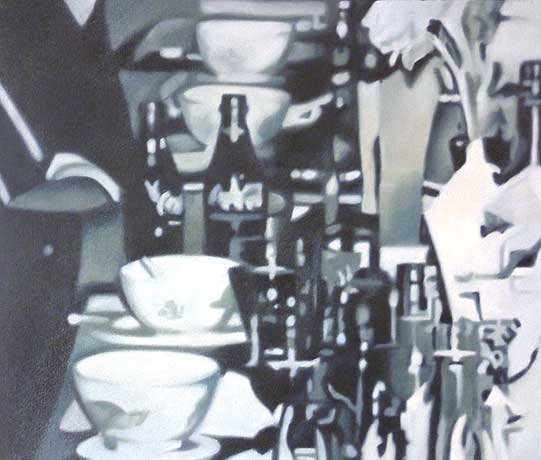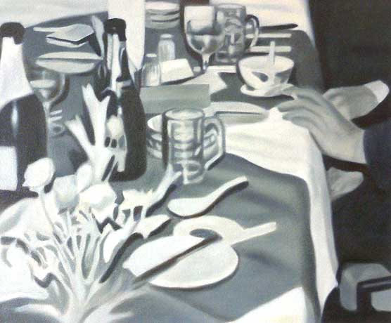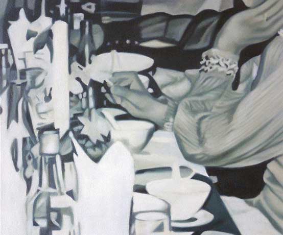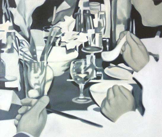 What Preller has painted then, is not so much the fragments of a dinner party as a set of references to a dinner party; a clearly recognizable, middle-class code captured over and over again with brownie cameras by those of our parents’ and grandparents’ generation. The result is less a nostalgic reminiscence than a study of the quality of nostalgia. Her work separates parts from the whole in order to examine precisely what it is that makes us remember, what it is that we unconsciously fix upon to orientate ourselves in relation to the past and to the world. In so doing Preller alludes not only to the photographs from which she draws both her images and her inspiration, but also to the black and white films of the fifties and sixties, and, finally, to that master of nostalgia and sentiment, advertising.