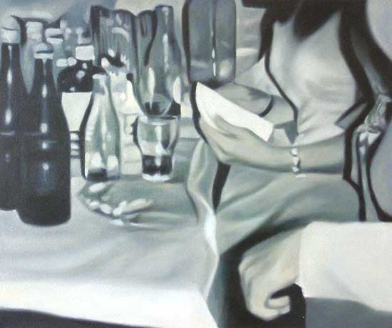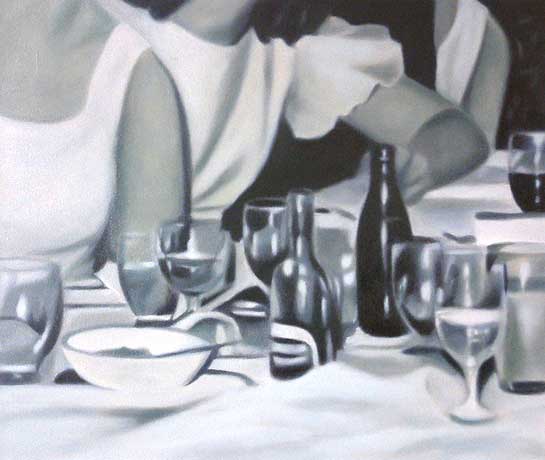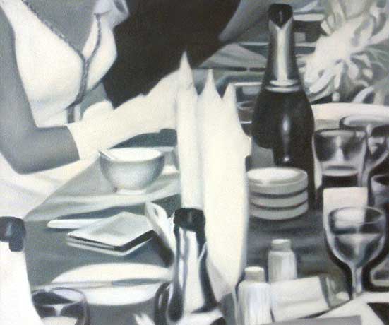 The paintings in Preller’s series “Out on the town c1970” are taken from photographs of dinner parties in the late sixties and early seventies. We recognize the period and the class of the subjects from the cut of the bodices, the objects scattered about, and the table settings. The latter seem straight out of 1960s cookbooks, the more conservative kind that were the last relics of the kind of domesticity still alive in the forties and fifties but fading with beehive hairstyles in the sixties. Except that there really are no clearly identifiable subjects in these images. Rather, the paintings have a kind of synecdochic effect, a suggestion of the whole through reference to parts. The white-gloved arm, for example, suggests an elegance and self-awareness on the part of the wearer whose face we cannot see. The crowds of half-empty wine glasses and the champagne bottles with their seals torn raggedly convey a genteel liberality, a certain self-conscious propriety that came with the kind of gathering suggested by these images.