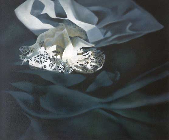 In her still lifes – silent, monochromatic renderings of bowls on cloths – Preller deliberately places herself within a painterly tradition, drawing us away from the references to photographs in her other works. Ironically, however, it is the still life that has always been the most photographic of painting genres, or at least the genre whose relationship to real objects is most plain, taking as its starting point the clear mandate to render a set of objects as accurately as possible. The result is an image that is both a painterly exercise – a study of the relationship of objects to one another within a prescribed space, of textures, of volumes and light – and a purely aesthetic apprehension of inanimate objects.