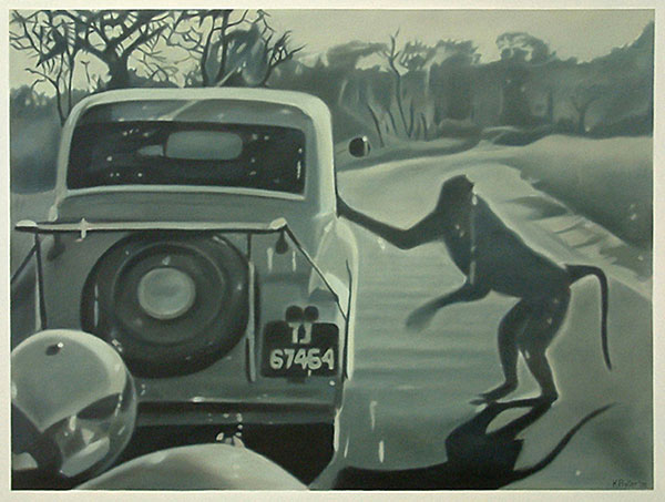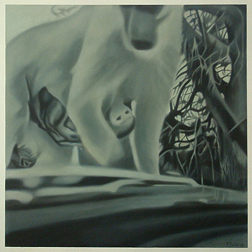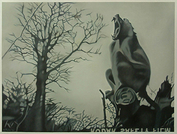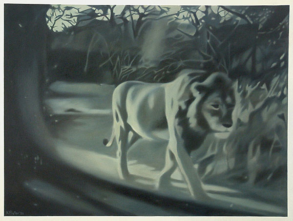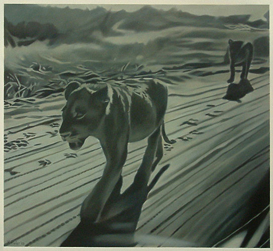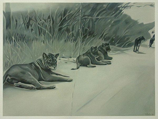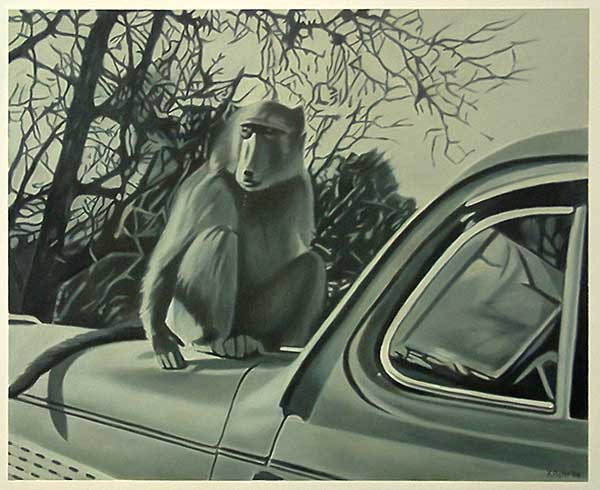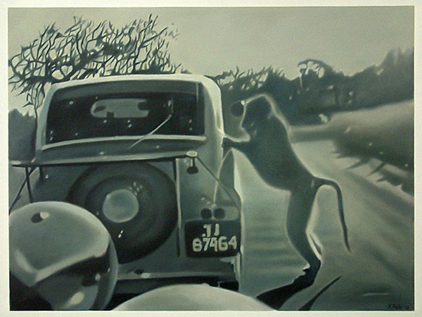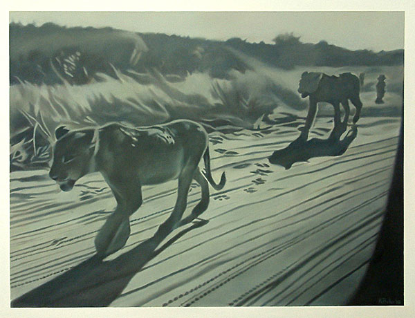 The gaze in the photographs registers the obsession, since the inception of photography, to document and provide evidence of visual experiences, in this instance of animals, the landscape and the rest camps of the Kruger National Park. The snapshots signify the quest for mythical ‘nature’ which is authentic and untouched, yet navigable and harmless. The paintings are firstly reproductions of that initial gaze and secondly they document the drive to record shared and stored memories. Sight is mediated through the aperture of the camera, but also through the car window - the car acting as facilitator which places the animals and the landscape both within and beyond reach. The subject is undermined in that the intervention of the camera and the car is made clear, subverting both wildlife painting and photography in its usual descriptive attention to detail, and in its efforts to capture the animal in a pristine, untarnished environment.