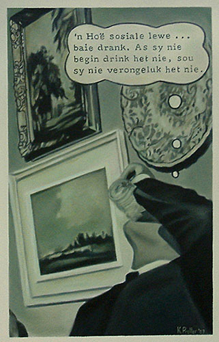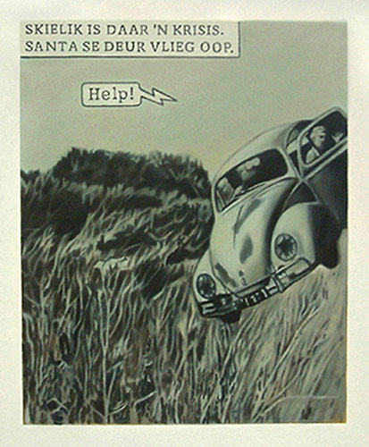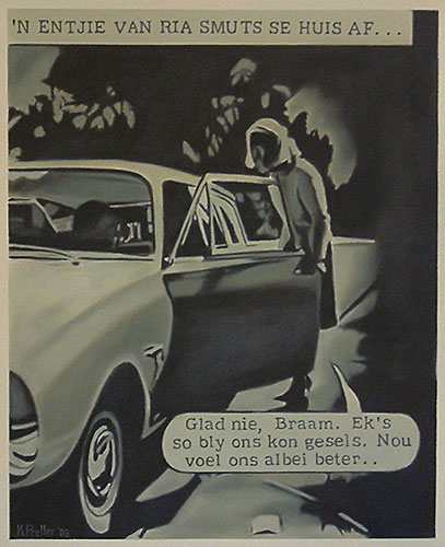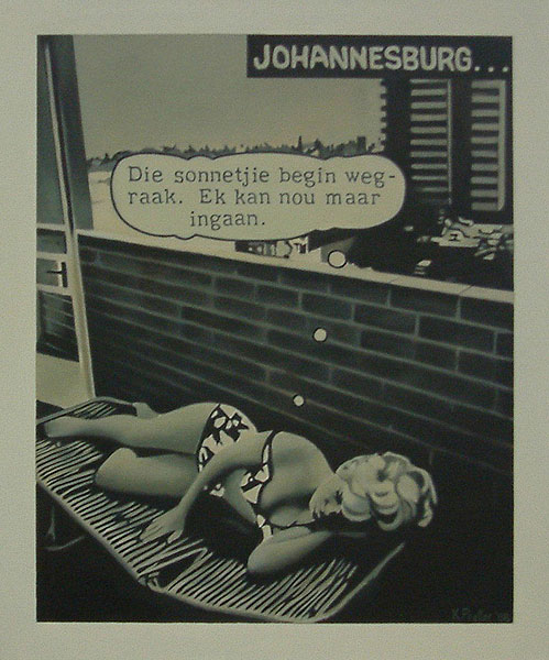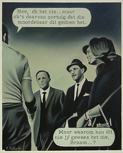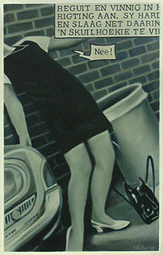 Stills from iconic picture comics of the 60s and 70s, published by Republican Press, are source material for Karin Preller’s work on exhibition. Apart from escapist yarns such as ‘Cha the white apache’ and ‘Ruiter in Swart’ the picture books, as they were called, resembled an idealized and insular white, middle-class, urban existence. With the trite staples of melodrama, they fed the fantasies and desires of a readership encompassing whites and blacks.